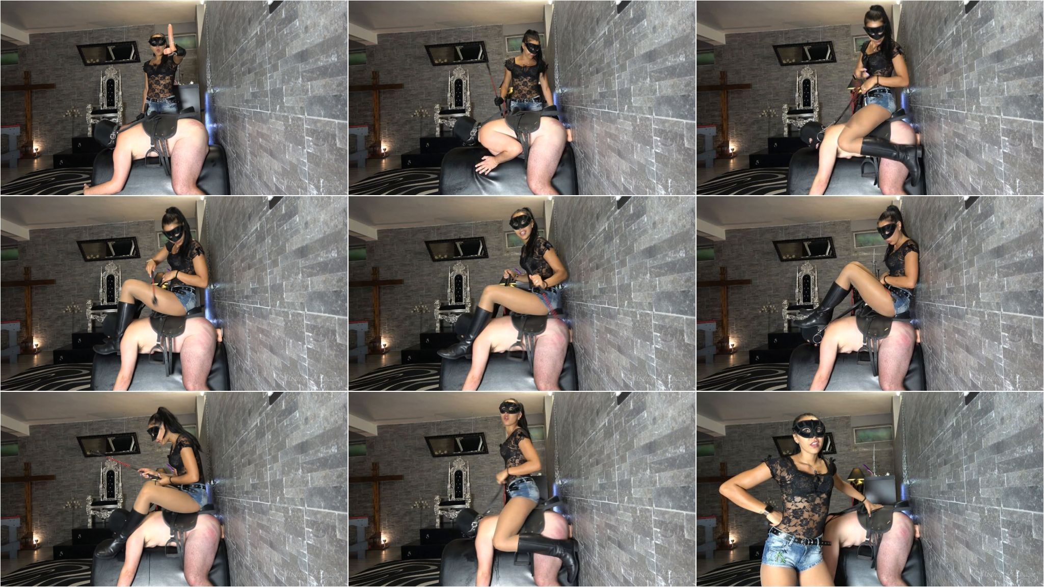 I have my slave ready to receive some pony training. I thought I would try a novel way to give him some added incentive. So I have a large dildo to hand, and I’m going to use it on my ponyboy. With him already in the saddle and waiting, and as you can see I have placed him on the bench near the wall. His dildo has a sucker at the end, and I’m going to make sure it doesn’t fall out of his sorry ass. I tell him obedience is key, as I shove the dildo into his ass and stick it to the wall. My ponyboy is now ready to go. I mount him and begin to whip him with my riding crop. As he goes back and forth, he is also getting a good ass fucking at the same time. It’s turned out to be a great incentive. Riding him harder and harder, I’m enjoying making sure he suffers. What a good little dildo pony…