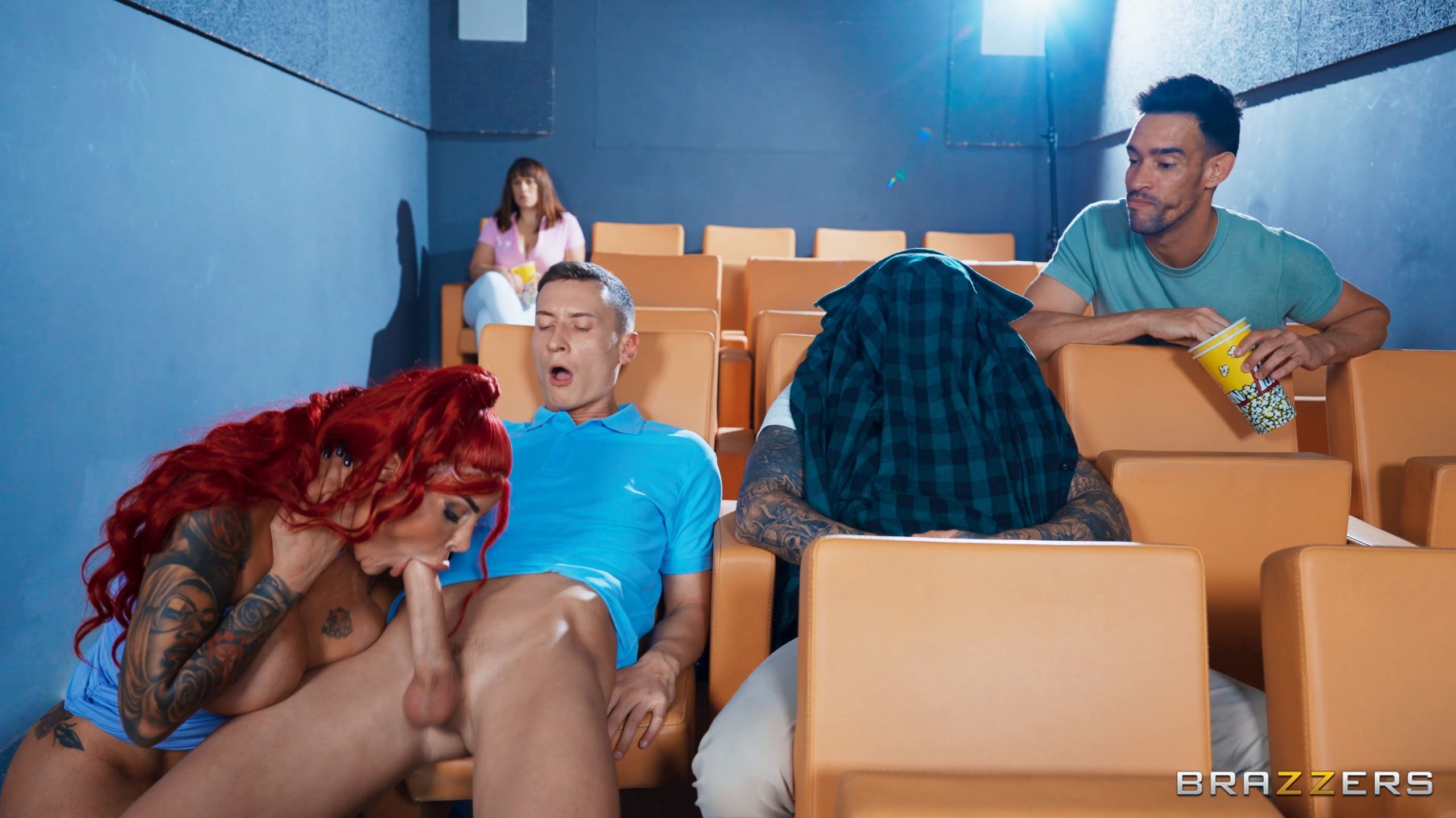 Charlie and his girlfriend sit in a theatre waiting for the movie to start. As she annoys Charlie, sexy Niky and her boyfriend enter the theater, and their argument gets Charlie’s attention. Niky catches him staring and makes sure he sees the butt plug in her amazing ass before she sits down. Charlie tries to play it cool but Niky covers her sleeping boyfriend with her jacket before tossing popcorn at Charlie and flashing him her huge tits when he looks back at her! Charlie can’t take it anymore and when Niky throws her thong onto his head, Charlie tells his girlfriend he’s going to the washroom… But heads straight for Niky who gives him sneaky head, to the chagrin of the other moviegoers! Charlie cums early so Niky spits his cum into her popcorn, causing some of the nosy moviegoers to leave, before Charlie removes her butt plug and slides into Niky’s ass. Charlie’s girlfriend almost catches them but Charlie hides behind Niky as he eats her ass. He slides back in but they get busted after an anal creampie when the usher returns with the nosy moviegoers and flashes his light on them!